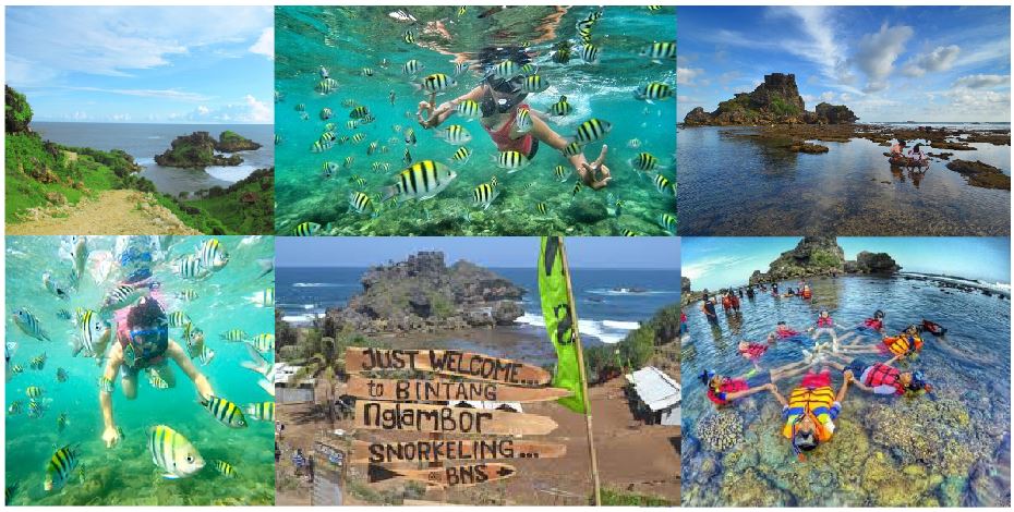 Kabupaten Gunungkidul yang sudah terkenal dengan banyaknya pantai baru dengan tampilan yang masih asri dan alami. Pantai yang menawarkan destinasi menyelam bersama ikan-ikan laut dapat Anda lakukan di Pantai Nglambor. Pantai Nglambor yang terletak di Desa Purwodadi, Kecamatan Tepus, Gunung Kidul adalah tempat Snorkeling di Jogja yang paling terkenal jika dibandingkan dengan tempat lainnya. Berjarak kurang lebih 70 km dari pusat kota Jogja, pantai ini menawarkan panorama pantai yang indah. Terdapat dua batu karang besar yang menyerupai kura-kura persis di depan teluknya.